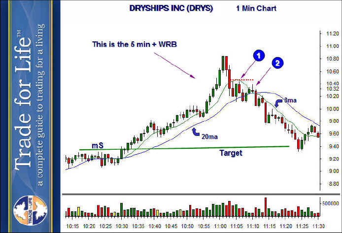 Below is a five minute chart of DRYSHIPS INC (DRYS). This play was done in the VCM Proprietary Trading Room, and was discussed as a very aggressive trade. The strategy was a climactic advanced sell (CAS). It is so aggressive; our earlier level traders are not allowed to play it. That is because this is the one strategy that fights the trend. Fighting the trend violates one of the first good rules you learn when trading. For a play like this, we sometimes use the term ‘mini CAS’ because it is not a ‘great’ set up. The problems lie in the fact that it is not ‘way’ extended from the 20 period moving average, and we also missed having five or more green bars by the one tiny red bar in the middle of the run.