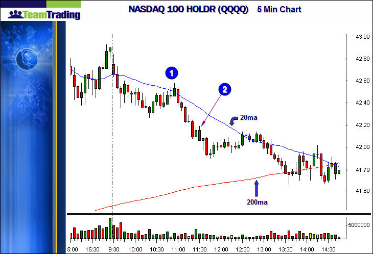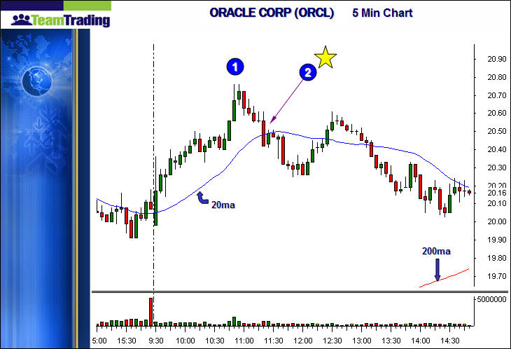 The numbers ‘1’ and ‘2’ match the first chart exactly in terms of the time of day. Note the great relative strength of ORCL at the time of ‘1’ on the chart. ORCL ‘blasted off’ to hit the high at ‘1’. The market rallied, but notice it failed to make a new high. It stayed under the last pivot from 9:50 in the morning. At the time ‘2’ arrives, we are contemplating the purchase of ORCL on a VCM buy set up. Notice however, that any type of rule about the market would have you passing this trade. Why? Because the market is now in a five minute downtrend, red on the day, and under yesterday’s closing price. While occasionally some stocks may defy this rule, you will find that this rule will save you a lot of money.